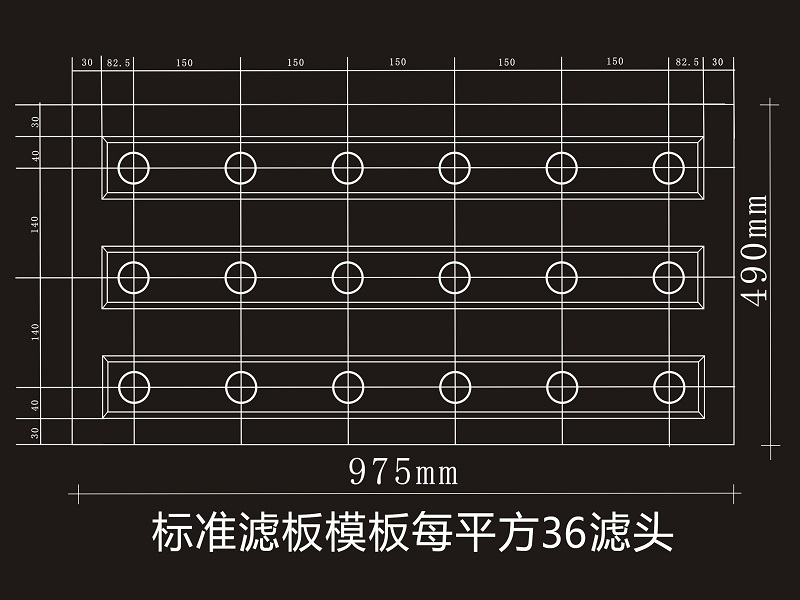 A型模板長×寬×高(975×490mm×55mm),厚度3.0mm,誤差0.2mm;可安裝濾頭數(shù)量18個/塊和21個/塊。相當于36個濾頭/㎡(縱向間距150mm,橫向間距140mm),42個個濾頭/㎡(縱向間距130mm,橫向間距160mm)濾梁中心間距1000-1060mm。